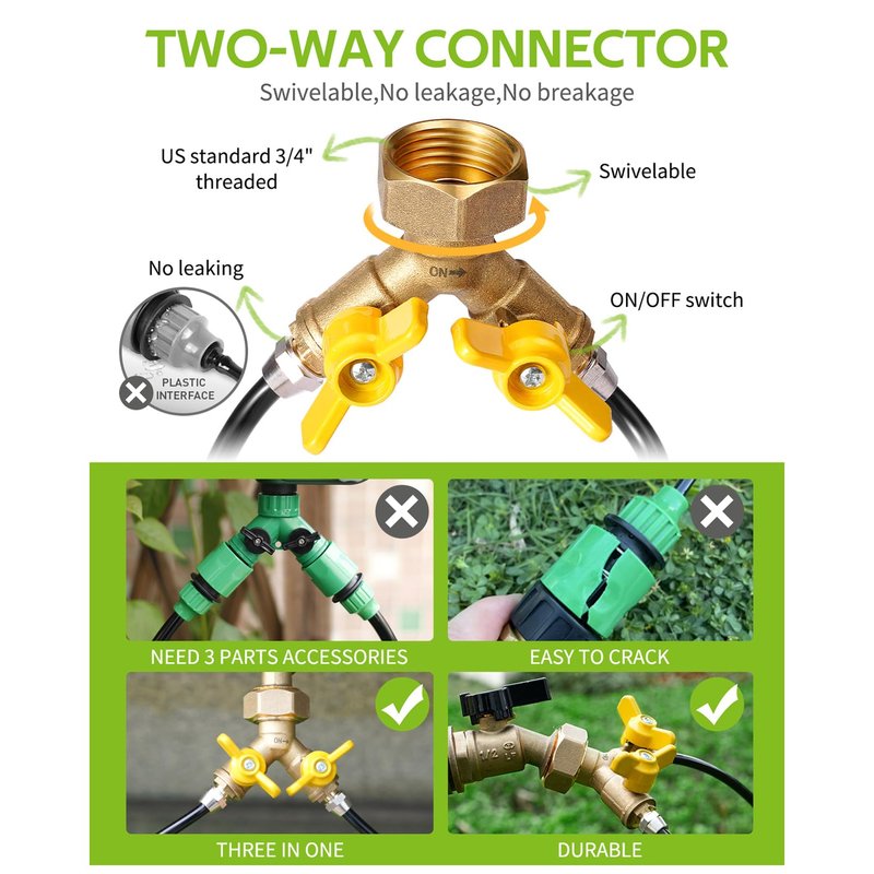 - [No-leaking Brass Splitter] The drip irrigation system kit provides the exclusive splitter, which has a solid brass construction and no rust. It can not only separate two drip line, but also be adjusted by the butterfly-shaped switch. US standard 3/4" threaded size, widely matching for the garden connector, such as outdoor faucet, hose splitter, garden filter, garden timer.