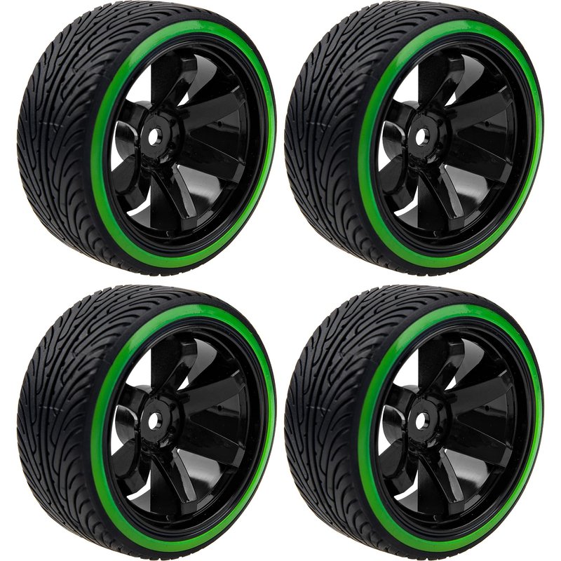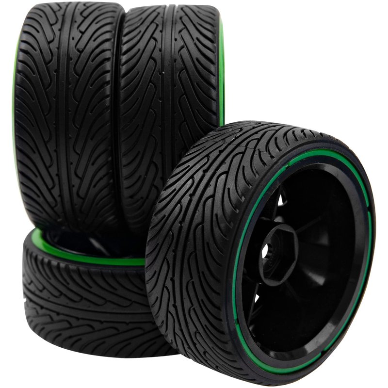 HIRCQOO 1/10 RC Drift Car Tires 12mm Hex Hub Wheel Rims & Hard Plastic Tyre 6 Spoke Compatible with Traxxas HSP Tamiya Kyosho HPI Redcat 1/10 On-Road RC Drift Drifting Car (Green)