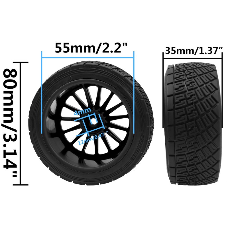 - 2.Size Info: Tire Outer Diameter: 80mm/3.14" ; Tire Width: 35mm/1.37"; Rim Inner Diameter :54mm/ 2.12" ;Wheel Drive Hex: 12mm/0.47"; Axle Hole Diameter: 4mm/0.15".