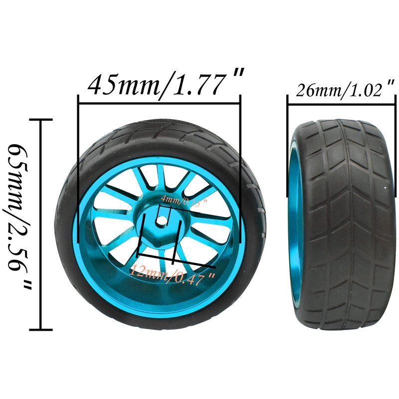 - 2.Size Info: Tire Outer Diameter: 65mm/2.56'',Tire Width: 26mm; Tire Inner diameter: 45mm;Wheel Drive Hex: 12mm; Axle Hole Diameter: 4mm