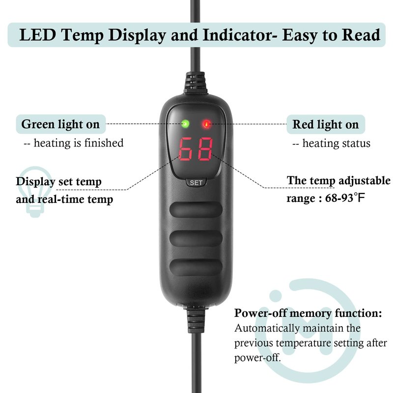 - 🐟Easy to operate: This fish tank heater is easy to use, 6Ft long cable wire and the external controller can easily set the temperature, and the temperature adjustment range is 68-93℉.