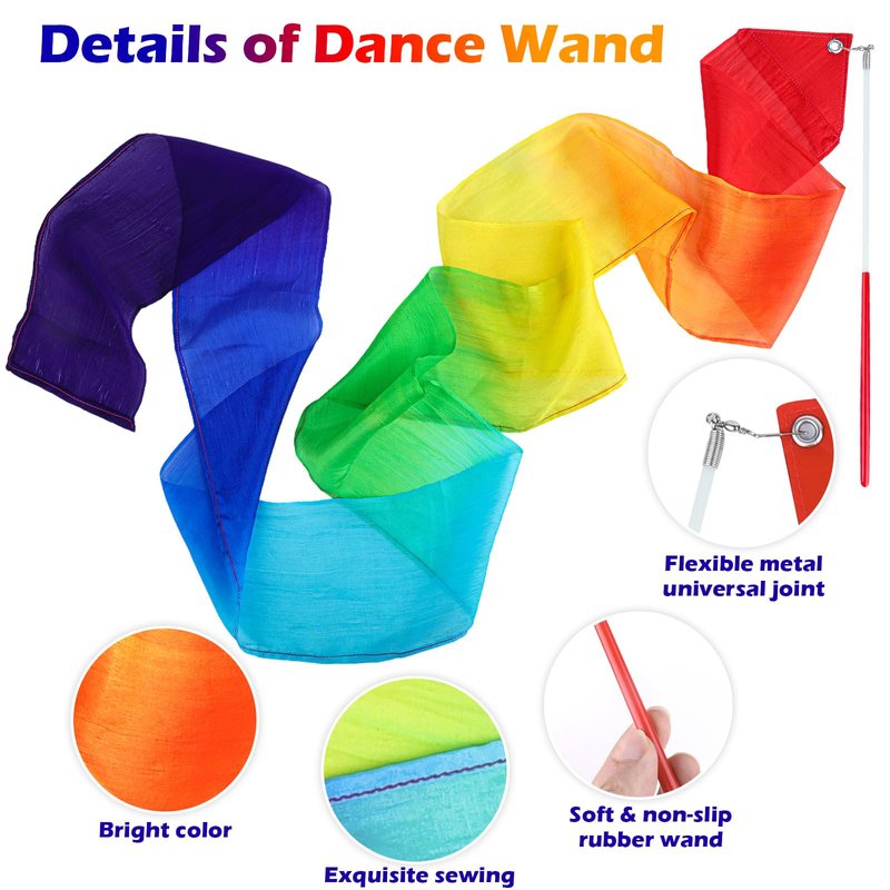 - 100% PURE SILK MANUFACTURING - This rainbow dance ribbon is made of 100% pure silk, with bright colors like a rainbow. Silk is lightweight, comfortable, and easy to float in the air. The soft touch brought by silk is deeply loved by children, who are enthusiastic about touching and playing with this silk material.