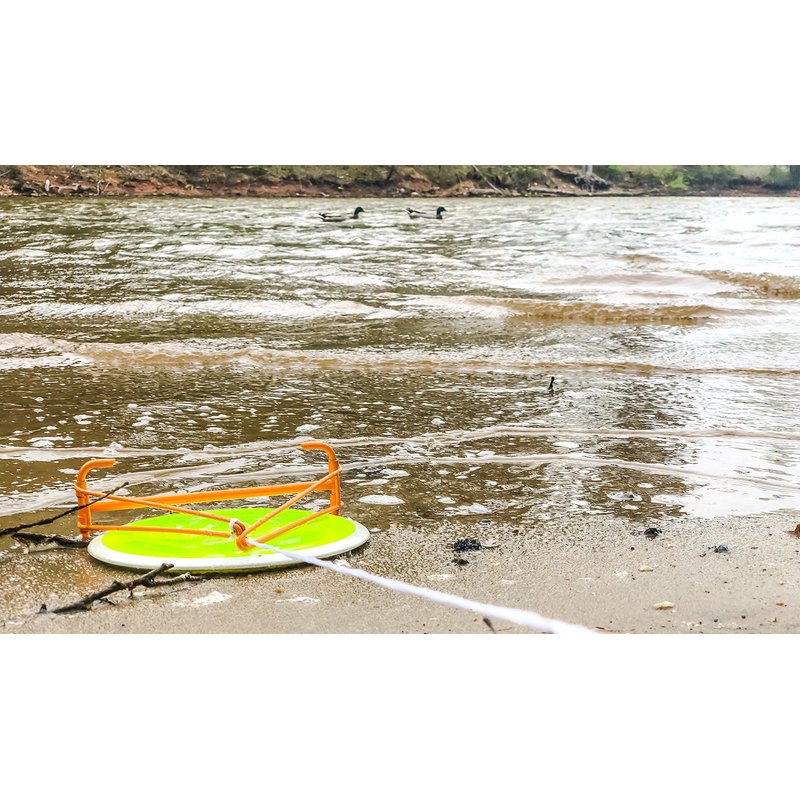 The Disc Claw greatly improves upon a familiar design - the compact collapsible disc retriever. That's where the similarities end and the innovation begins! The Disc Claw grabs discs from both top and bottom claws rather than in between. This allows a greater range of disc resting angles to be captured by the "claws" and pulled into the retriever. And by placing two short claws on bottom rather than a full-width wire frame, the Disc Claw stirs up far less of that dirt and silt that clouds the water. When your retriever leaves the water less murky and pulls in discs from more angles, you're going to get your disc back more often! The Disc Claw folds up into a compact unit that fits in any disc golf bag. The long string included is capped off with a metal ring so that you don't accidentally toss the whole thing in the water. Get more plastic back today with the innovative new Disc Claw from Hive Disc Golf!