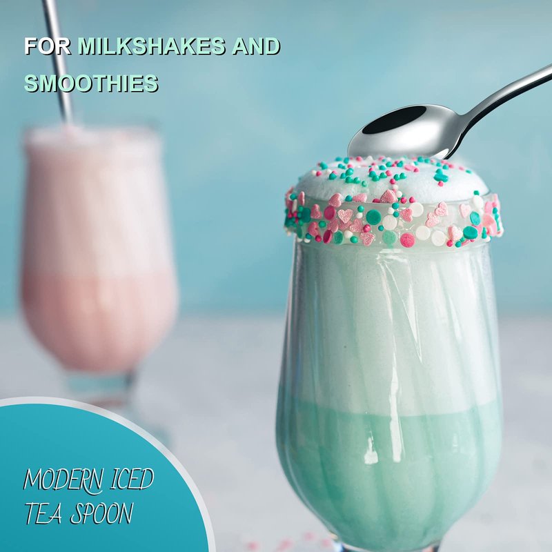 - 9 inch long handle heavy-duty iced tea spoon can lead directly to the bottom of Ice cream soda glass, sundae and dessert cup, milk shake, tall coffee mugs