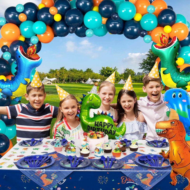 - 【Dinosaur Themed Party Supplies Set】HJINGY 140 pcs dinosaur birthday decorations will satisfy all your demands for boy or girl birthday party, including 130*latex balloons (dark blue, light blue, orange, yellow), 5*dinosaur balloons, 1*happy birthday backdrop, 1*tablecloth, 1*dot glue, 1*balloon chain, 1*balloon knotter, 1*ribbon