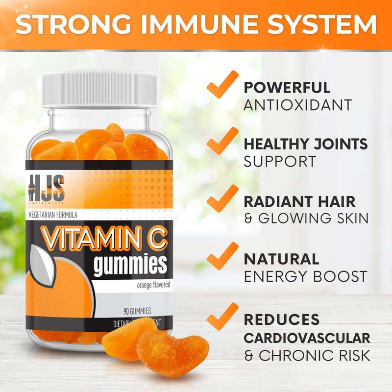 HJS Supplements Vitamin C Gummies | Chewable Orange Flavored | Immune Support | Heart Health | Gluten-Free & Vegetarian | Vitamin C Gummies for Adults & Kids- 90 count