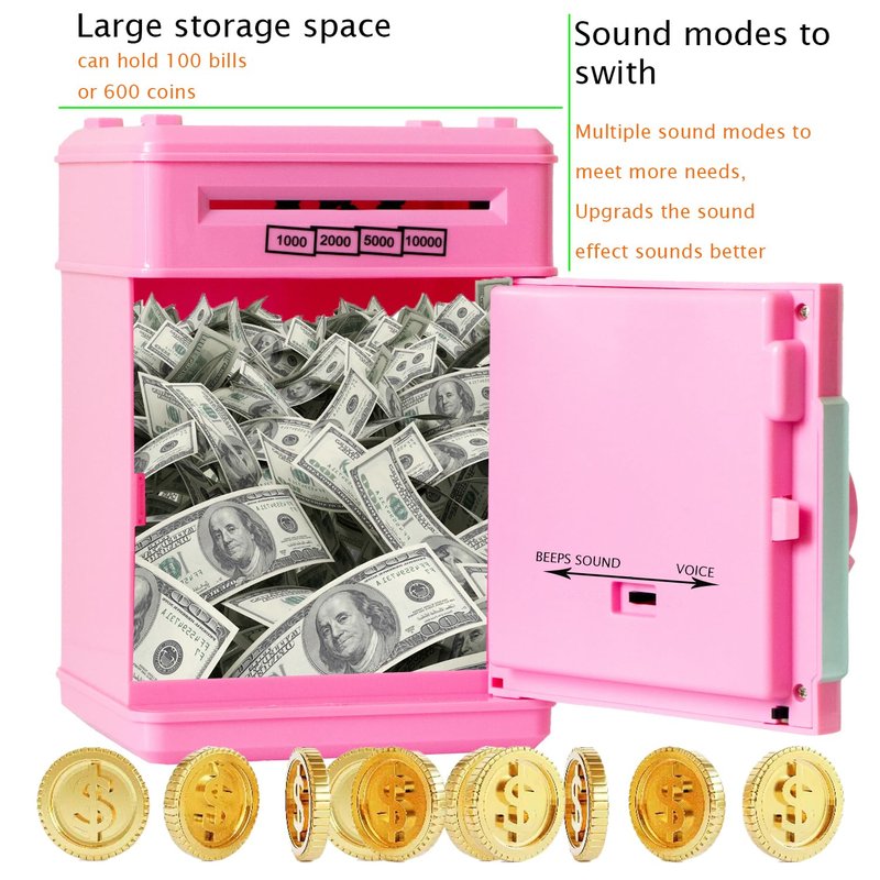 - 💰[ATM Piggy Bank Toys-Financial Assistant] This is a good quality and attractive electronic piggy bank, can store 600 coins or 100 banknotes, Password protection ATM piggy bank is the guardian of children's pocket money,Saving money education ,Keep kids entertained,3 sound modes to swith,The automatic storage method will make children fall in love with this piggy bank,About birthday gifts for boys age 6-8-10,Christmas gifts for 4+ years old boys, This piggy bank is the idea choice.