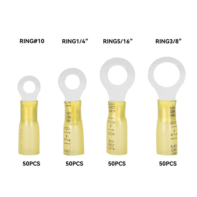- [Red Copper 100Pcs KIT]There are 100 Pcs heat shrink ring terminals,4 sizes #10,1/4",5/16",3/8" - 25Pcs per size, Yellow - AWG 12-10. Tinned copper barrel ensures a strong wire crimp .Heat Shrink Wire Connector can fully clamp the wires, wire will never slip out of electrical wire terminals crimp connectors.