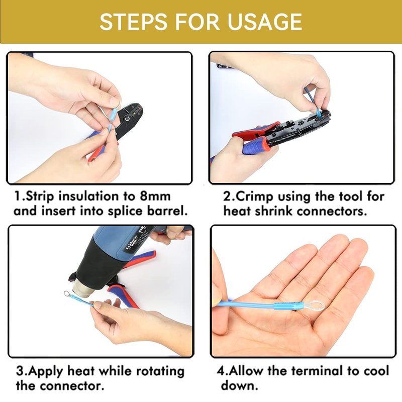 - [Easy Application]Strip wire insulation, use wire crimper crimp Heat Shrink Wire Connector and wire , apply heat with a heat gun while rotating a terminal. Electrical wire terminals crimp connectors will reduce in size and adhere to the wire.No need soldering set . Safe durable connection Finish quickly.