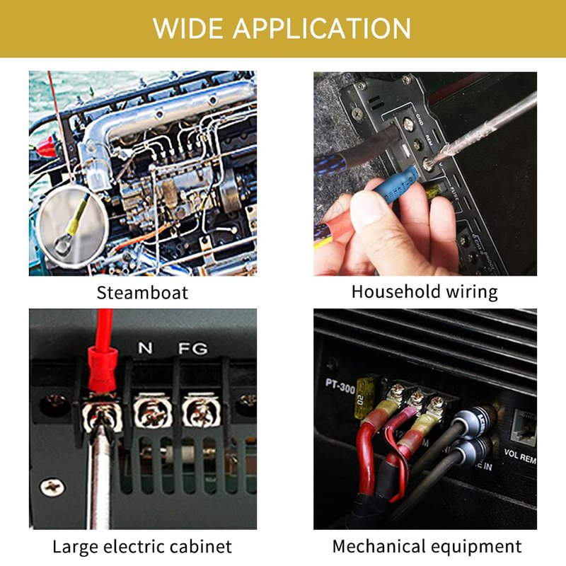 - [Insulated Waterproof Seal Prevents Wire Corrosion]Whether you are working on your boat, motorcycle ,vehicle, home or scientific project, our Heat Shrink Wire Connector electrical wire terminals crimp connectors will ensure strong crimps, increased current flow and waterproof connections every times.