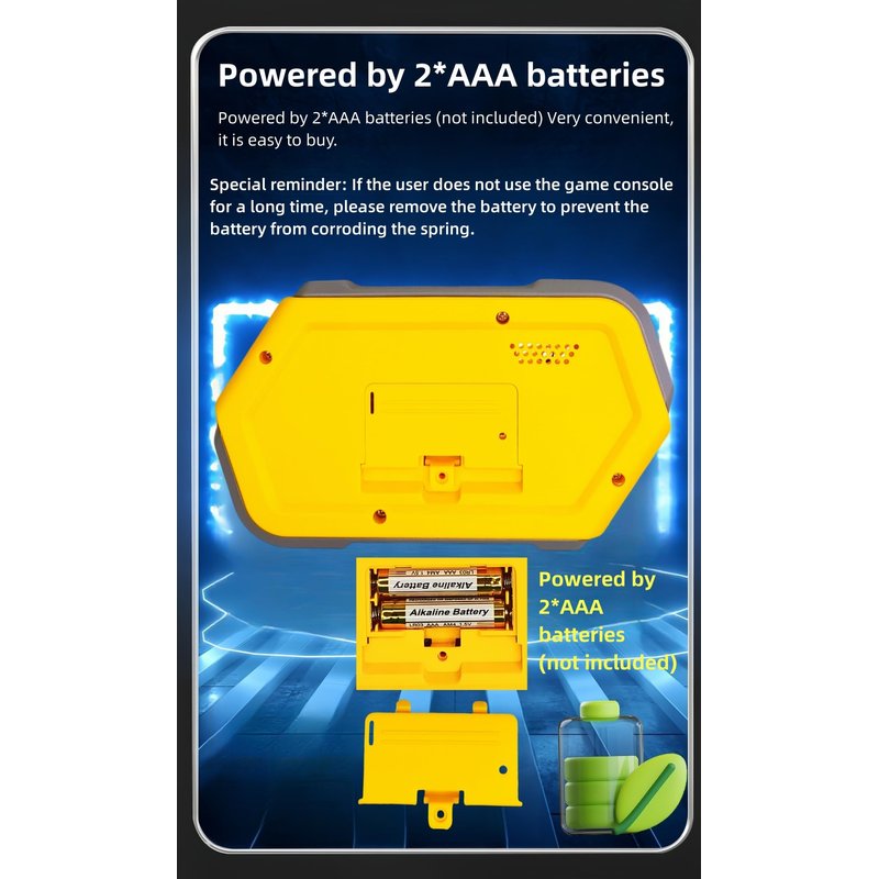 - ★★Powered by 2*AAA batteries★★Powered by 2*AAA batteries (not included) Very convenient, it is easy to buy. Special reminder: If the user does not use the game machine for a long time, please remove the battery to prevent the battery from corroding the spring.