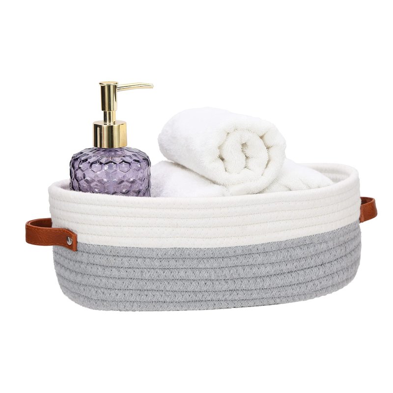 HLWDFLZ Bathroom Countertop Organizer Basket, Cotton Rope Woven Storage Basket Toilet Paper Decorative Basket for Bathroom, Bedroom, Living Room, Entryway 13"x6.3"x4.3" (Off White/Gray)