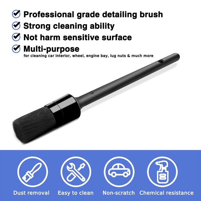 - Various size & Scratch-free: 5 different size premium detailing brushes are satisfy with any cleaning needs. Car cleaner brush can get into all the little cracks, the nooks, the lug nuts or tight space. The plastic handle prevent scratching paint or polish surface if you accidentally hit the car. The bristles are soft enough to protect the surface you're working on but tough enough to take off all the stubborn dirt.