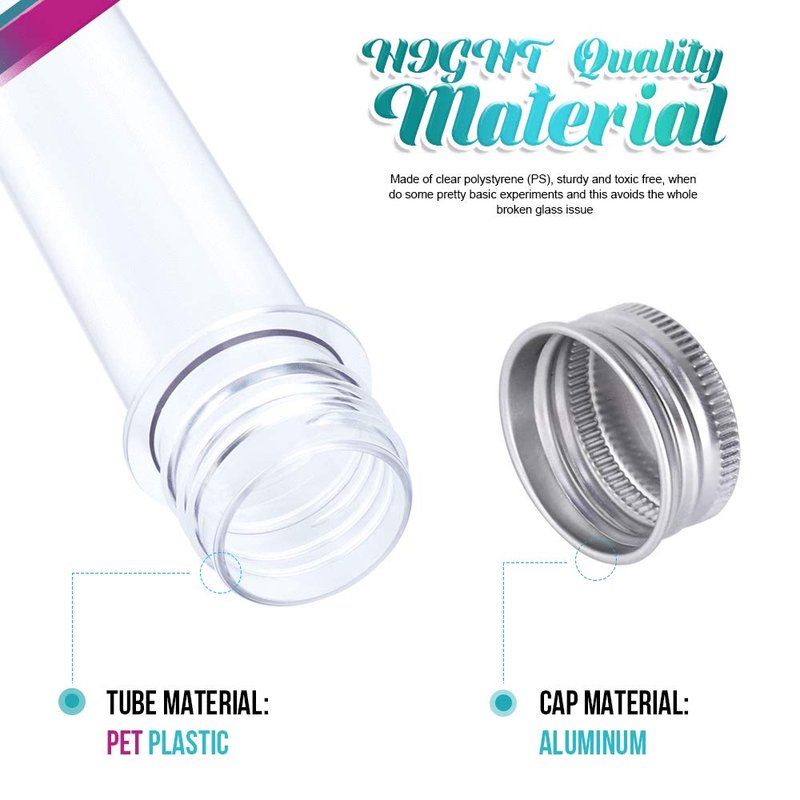 - What you get: 30Pcs clear plastic tubes with aluminum screw-on lids and packaged with pressure sensitive film. Enough for you daily use, decorate party, storage items, or use in lab, etc, all perfect.