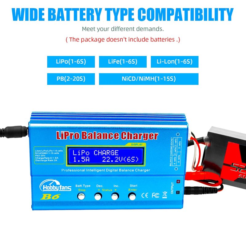 - Multiple Battery Compatibility - This B6 charger can charge a variety of rechargeable batteries, including NiCd/NiMH batteries, Li-ion batteries, LiPo batteries, LiFe batteries, LiHV batteries and Pb batteries. This is a multifunctional charger, you only need to select the correct battery type when charging, It is very convenient and easy to use.