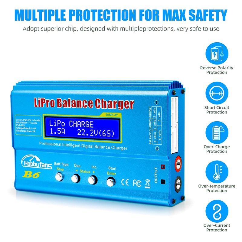 - Multiple functions - More than a regular digital balance charger, B6 comes with features like Li-ion and LiPO balancing, fast charging, data storage, cyclic charging, discharging, and much more for all of your battery packs.