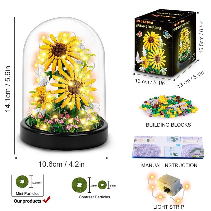 - 🌻MINI SUNFLOWER BUILDING BLOCKS: Valentine's Day is coming! Mother's Day is coming! Do you want to give your wife or mother a meaningful gift? This flower bouquet building kit is a unique ideal surprise and romantic gift or commemorative project, creating a beautiful display model sunflowers, flowers and grass made of mini bricks. Our sunflower decoration flower set is equipped with dust cover for better protection and dustproof.