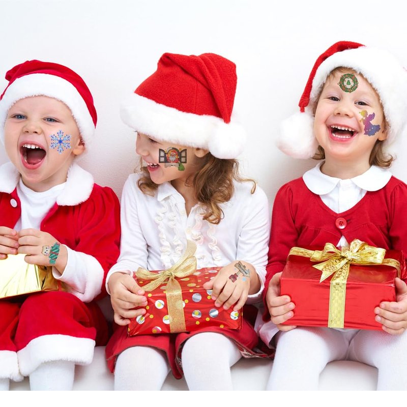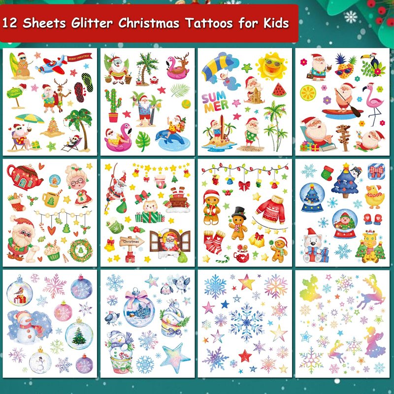 Package contents: 12 sheets glitter Christmas temporary tattoos.