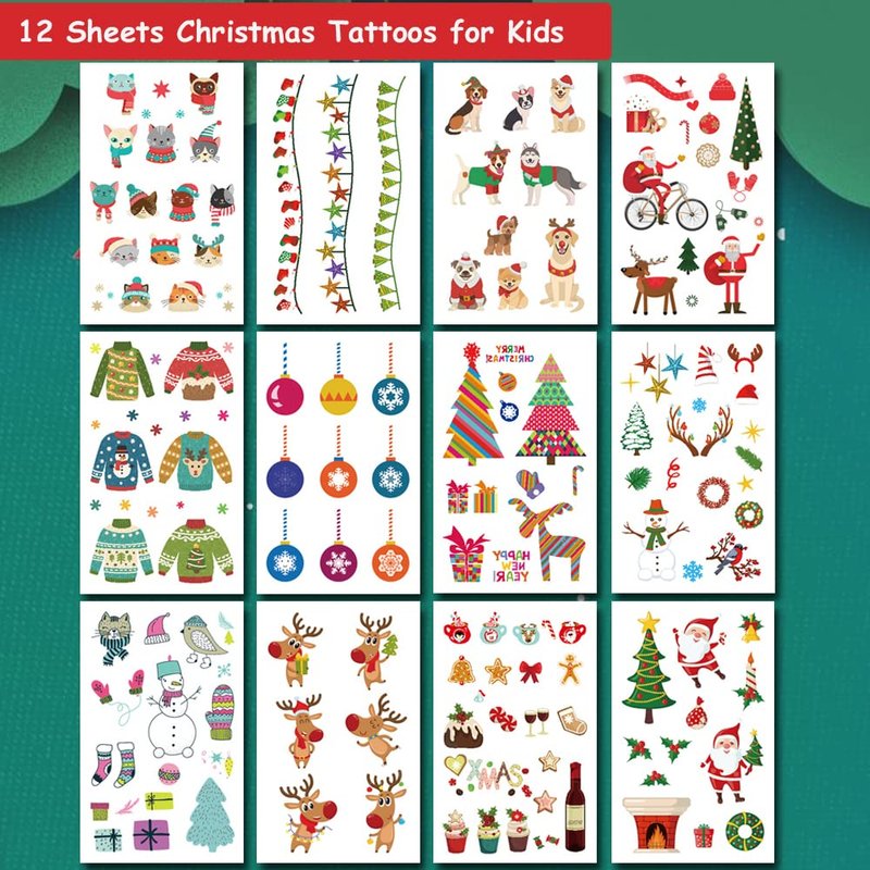 - 🎁【Value Christmas Temporary Tattoos Party Pack】You will get 12 sheets (4.72X2.95 inch) Christmas temporary tattoos, contains snowman, Christmas tree, snowflake, Santa Claus, cat, dog, elk and more.