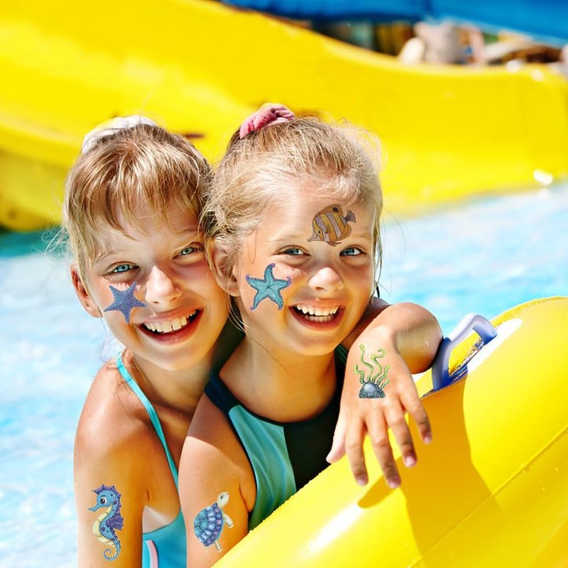 - 🎁【Value Glitter Sea animals Party Accessory for Kids】Popular hit with the kids. These glitter temporary tattoos are perfect for a party! You can choose the pattern you like and create your own style. Great for birthday party, sea animals theme party, children's day party gifts, halloween, christmas stockings, classroom rewards, etc.You can apply them to your body or some smooth objects, for example, glass, stationery, paper, crafts cups,cabinet,bottle.