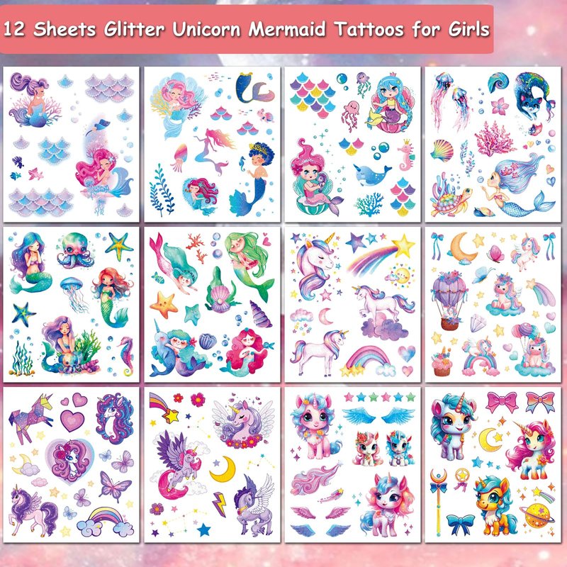 - 🎁【Glitter Mermaid Themed Tattoos for Girls Kids】Cute mermaid tattoos for Kids, use them as party favors and your kids will love. Perfect for mermaid themed party, birthday activities, school reward and other party events. They will be your kids' favorite small gifts.