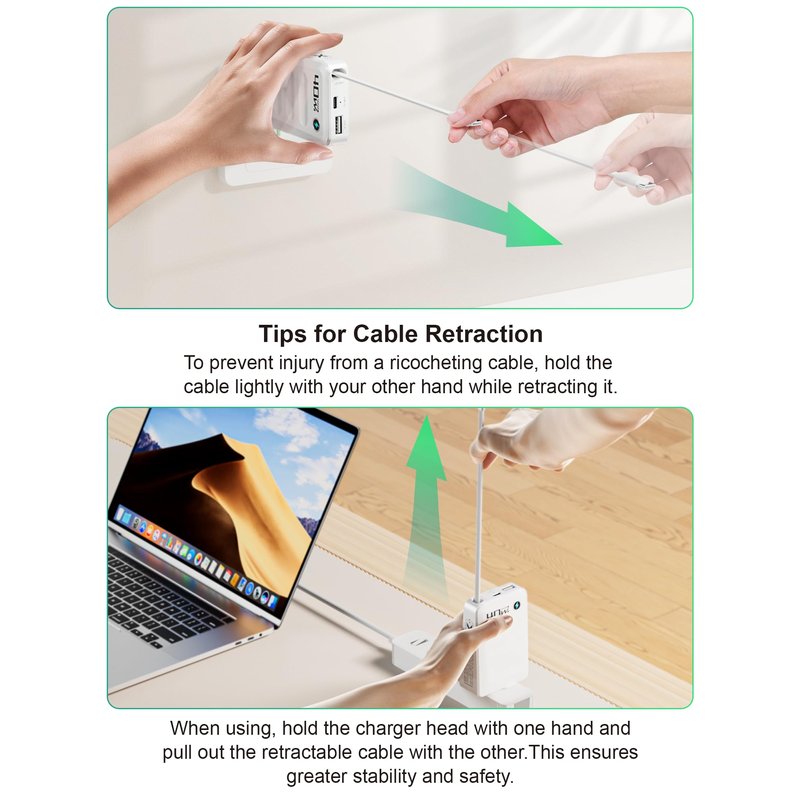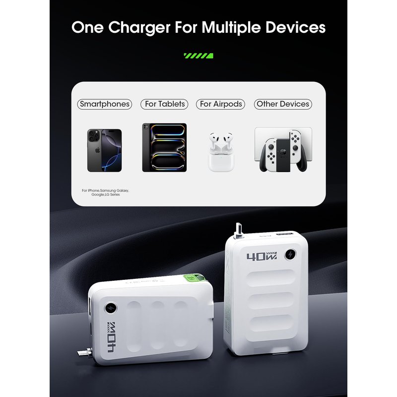 - Retractable Usbc Charger Block:Simplify travel with this 40W charger and retractable 33.5 Type-C cable. Pull to extend, retract to store – ideal for desktops, nightstands, and travel. Its compact, foldable design fits easily in bags without scratching, making it a single, convenient solution for all your charging needs.