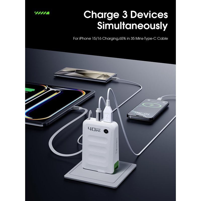 - Fast Charging Block:Get your Phone charged lightning fast! With Power Delivery & Quick Charge 3.0, our 40W charger juices up your device from 0% to 65% in just 35 minutes. USB-A delivers 3.1A/5V & USB-C offers 20W speed.