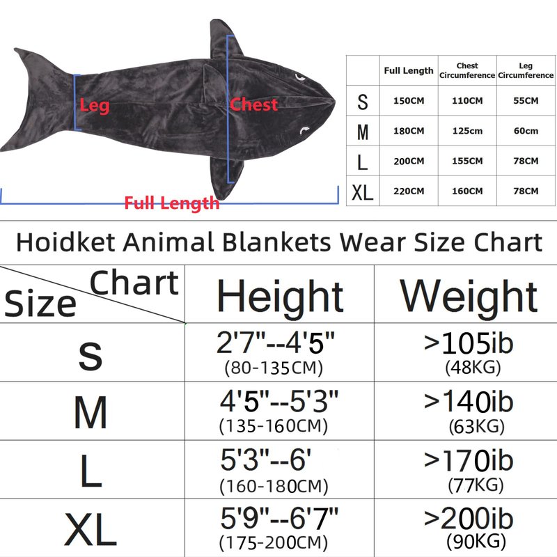 - Various Size : One piece shark design, it has the function of tail blanket and hoodie blanket at the same time.4 Sizes: S fits children 2'8"-4'5" (80-135cm) tall. M fits teenagers 4'5"-5'3" (135-160cm) tall. L fits adults or women 5'3"-5'10" (160-178cm) tall . XL fits adults or men 5'10"-6'7"(178-200cm) tall.