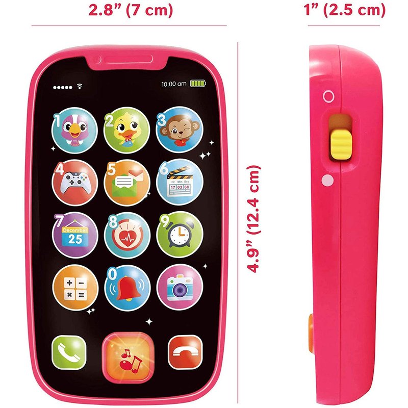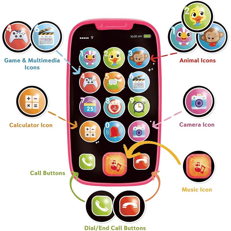 - ♫【KEEP BABIES JOYFUL IN ROLE PLAY GAMES】Full-screen roleplay smartphone toy with 12 icons, Each toy phone button plays realistic sound effects according to the icon pictured: animals, phone, alarm clock, joystick, camera and more; interactive baby toys are fun while they boost learning