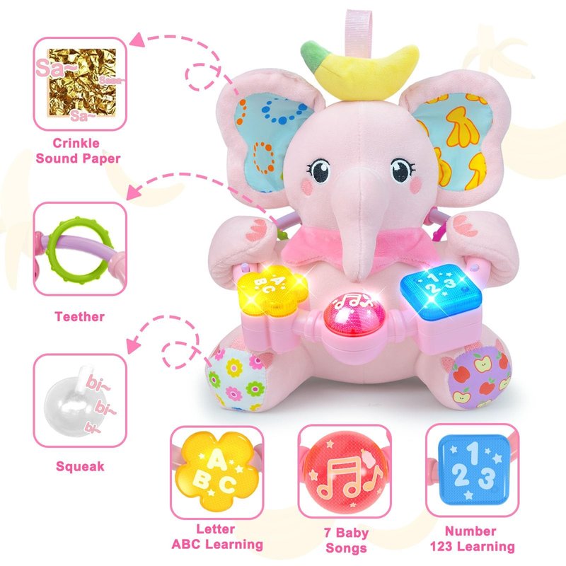 - Built for Fun:An easy-to-grasp bead ring hangs around the baby elephant toy.The bead ring has 3 buttons, Pressing these buttons activates flashing LED lights and learning of numbers 123,letters ABC, and playing 7 musical tracks. Additionally, there are 2 teethers located behind the grab ring, providing a variety of engaging experiences for baby toy 0-6-12 months.