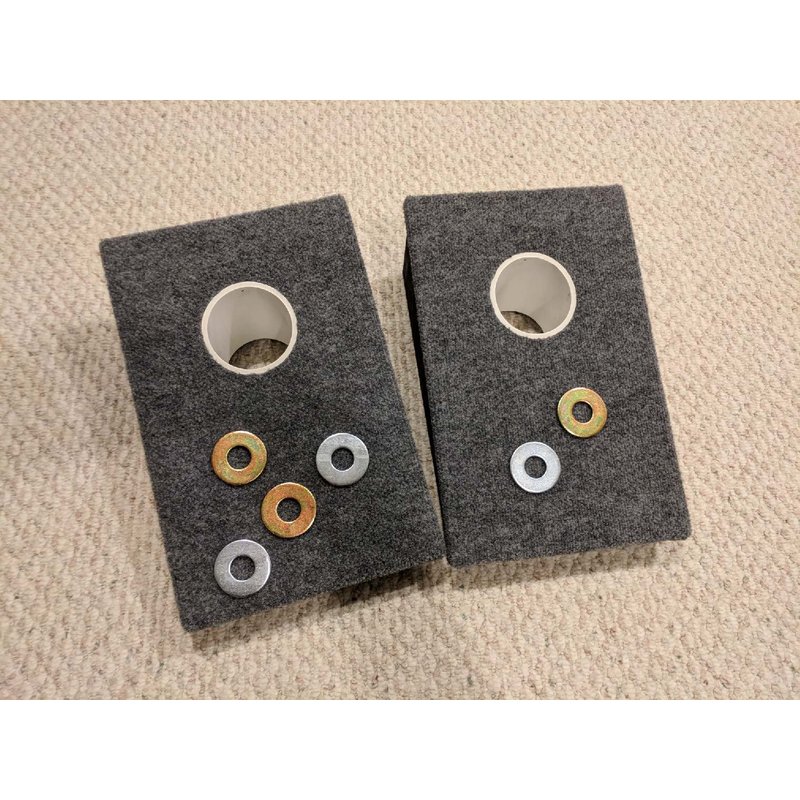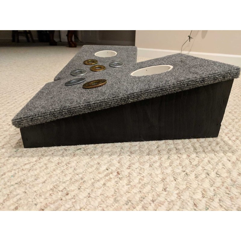 1 Hole Slanted Boards Washer Games uses a top made from 1/2" OSB and covered with indoor / outdoor carpet. Glued and stapled so it will stay securely fastened. The under frame box is made from 3/4 inch plywood and is both glued and nailed for strength. It’s painted for long life. The set measures 12”x18” and has a 4 inch incline. The 4" tubes sit just off the ground so no more lifting the boards to find your washers... 1 - 4” tubes, it comes with six 2 ½” inch washers. Silver zinc and yellow zinc coated washers... nothing to chip or repaint ever!! The proportions of a 4” tube and 2 ½” washer are critical and considered the standard in washer games. Standard rules call for the Game boards to be spaced 20 feet apart.