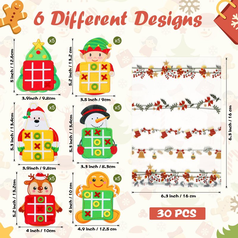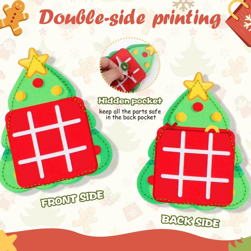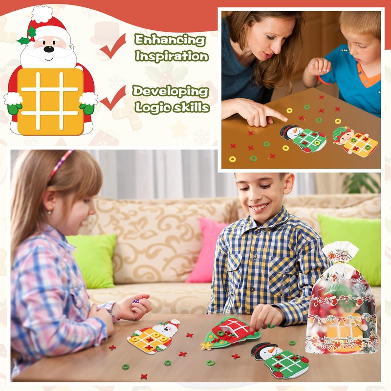 Features: Our Christmas themed tic tac toe game boasts 30 individually wrapped pieces shaped like festive patterns. Measuring 13 x11 cm, it includes 6 Xs and 6 Os in vibrant hues. With 6 adorable Christmas designs, it ignites kids' imagination and curiosity. This felt tic tac toe game fits good in its bag, doubling as a game board. Suitable for kids, it fosters creativity, social skills, and strategic thinking. Crafted from durable, lightweight felt, it ensures long lasting fun without wear and tear, making it a must have for family game nights. Specifications: Material: felt Size: about 13 x 11 cm Package includes: 30 x Tic tac toe game boards 30 x Tie wires 30 x Packing bags Notes: Manual measurement, please allow slight errors on size. The color may exist a slight difference due to different screen displays.