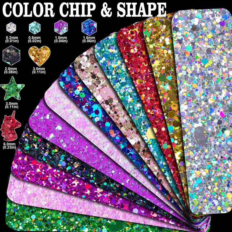 - ✨MULTIPLE SIZES&SHAPES: The glitter is mixed with different shapes(HEXAGON; STAR; HEART and UNICORN) in different sizes(0.2mm & 0.6mm & 1mm & 1.6mm & 2mm & 3mm & 6mm). The glitter is perfect for body & Face & Hair make up & nail arts decoration.