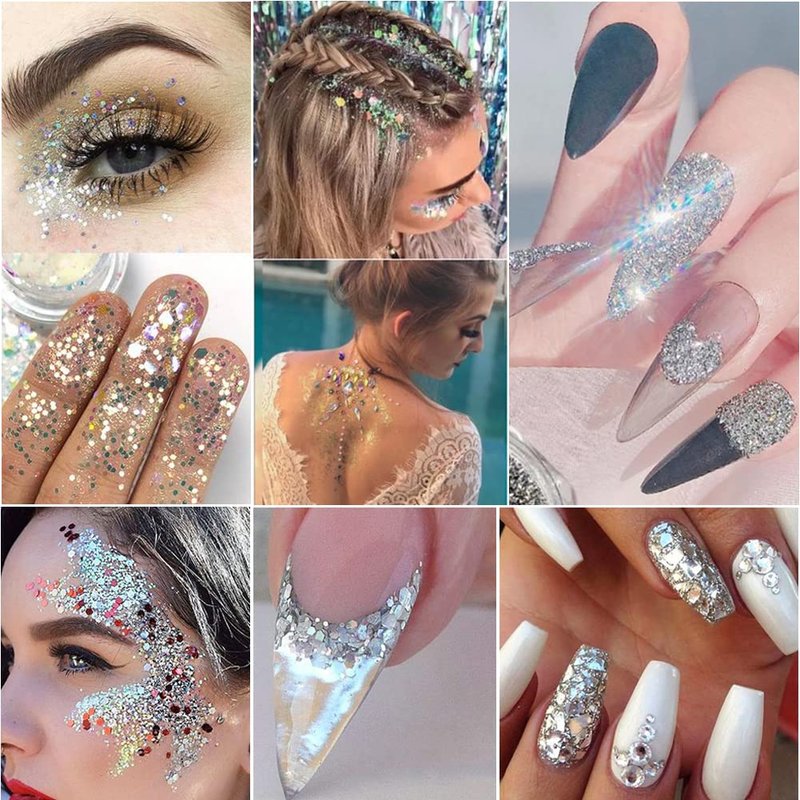 applied to create fun makeup looks for festivals, parties, fun events rave accents, dance recitals, cheer or costumes. They make amazing bling effect on face, eye, hair, shoulder, and chest.