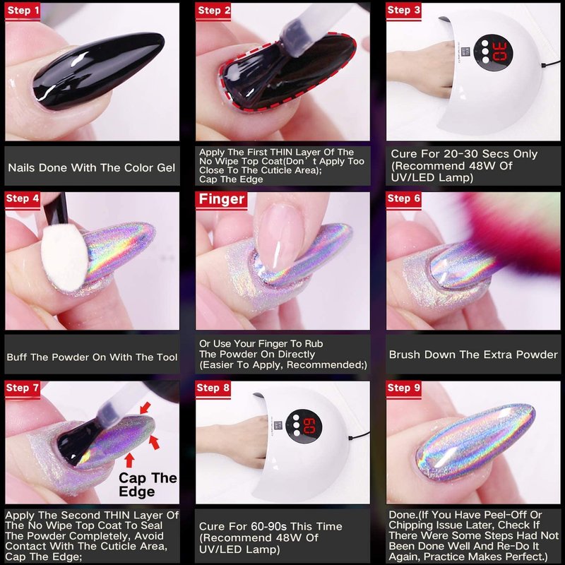 - ❤DIFFERENT HOLO EFFECT WITH DIFFERENT COLOR GEL APPLIED—Generally Speaking, The Holo Effect Will Be The Best If You Applied Dark Color Gels Like Black And Blue Before Hand, But If You Use Other Color Gels Then Apply Our Holo Powder, You Can Have Plenty Of Different Holo Effects In One Hand.
