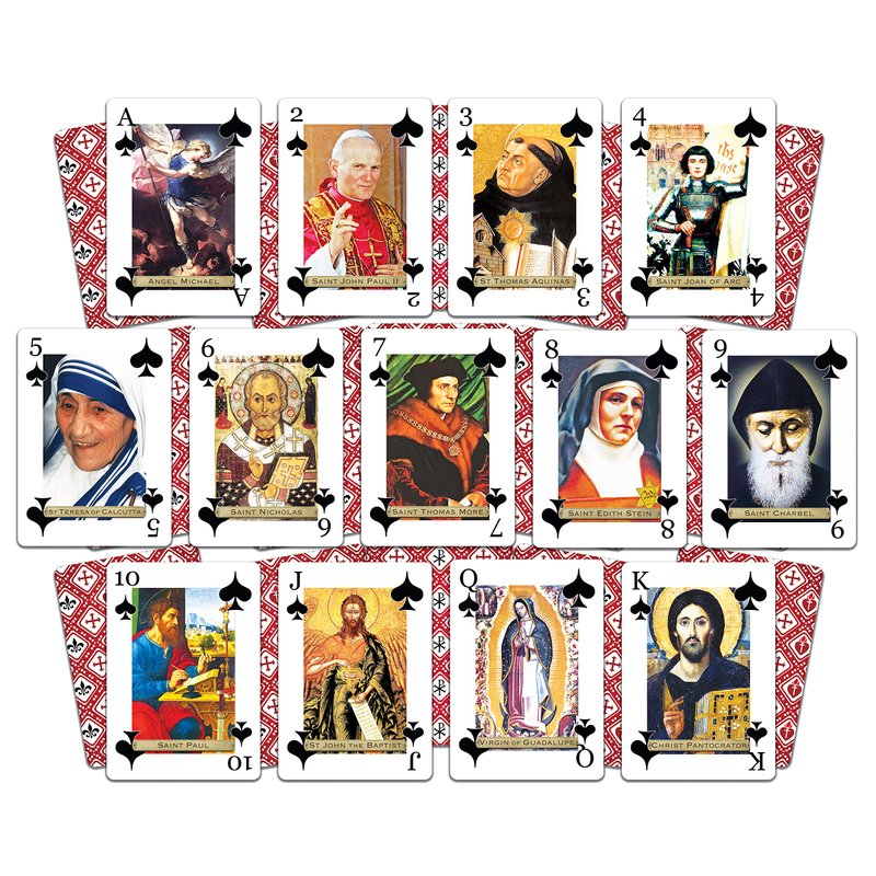 - Premium 52-card deck with beautiful depictions of 45 unique saints, plus reverent depictions of Christ for the King cards.