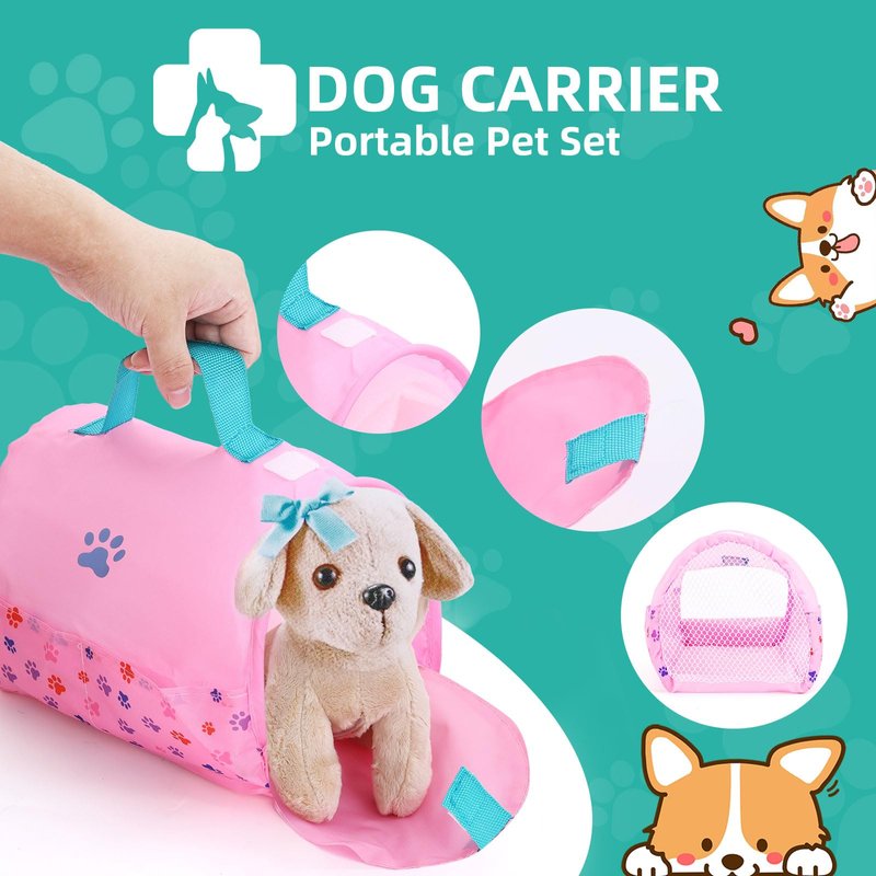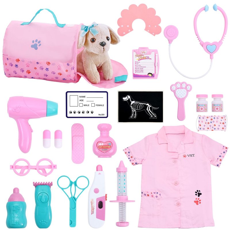 - Veterinarian Kit for Kids - This veterinary play set comes with a variety of simulated grooming tools for kids to play with, allowing them to pretend to be hairdressers for the plush dog. It includes an electric plush toy dog, stethoscope, syringe, thermometer, eyeglasses, pet storage bag, pet perfume, hair clipper, hairdryer, comb, scissors, and a pet bottle. With this complete toy pet vet doctor kit, children can experience the fun of pet ownership.