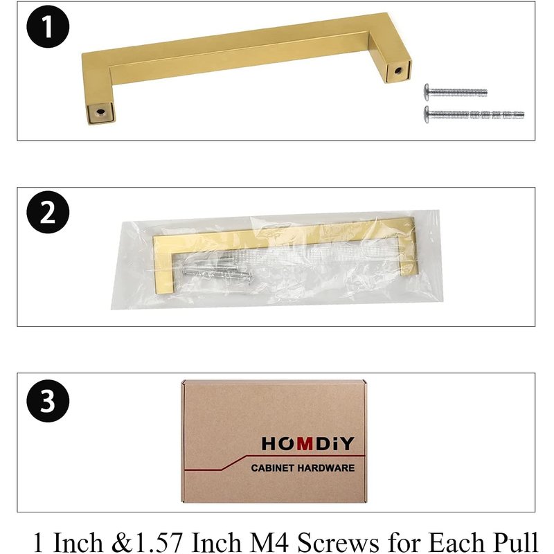 - Modern Square Pull: With brushed brass finish, homdiy cabinet handles will give the cabinet a new looking. Square design, ideal choice for kitchen, bathroom, bedroom cabinets and more. Smooth surface which let the handles keep beautiful looking.