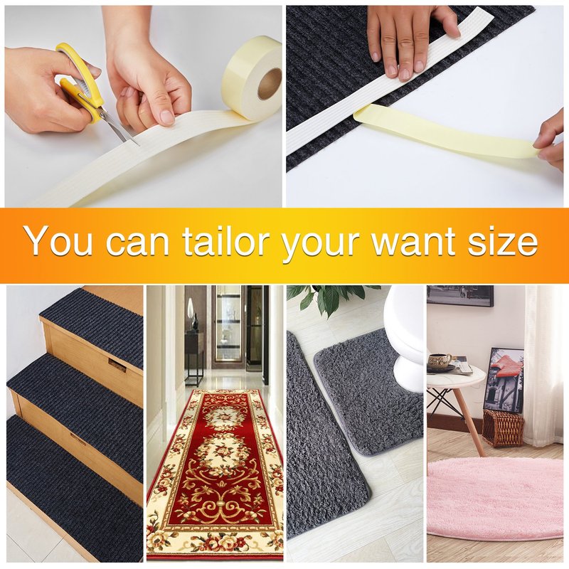 These 9.8ft(3 meter) type anti slip grippers can simply be stuck to the back of a rug. It is easy to take them off from the floors when need. They can be washed repeatedly. Use them on rug at the entrance, in the kitchen, or bathroom.