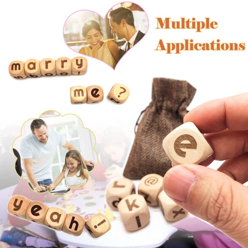 - Dice Set Content: Each set of dice set consists of 5 wooden dices and a linen bag; The display surface of each dice is engraved with the following contents: Dice1: a b c d e f; Dice2: g h i j k l; Dice3: m n o p q r; Dice4: s t u v w x; Dice5: y ? ! @ - z; It contains all lowercase English letters and 4 Common symbols.