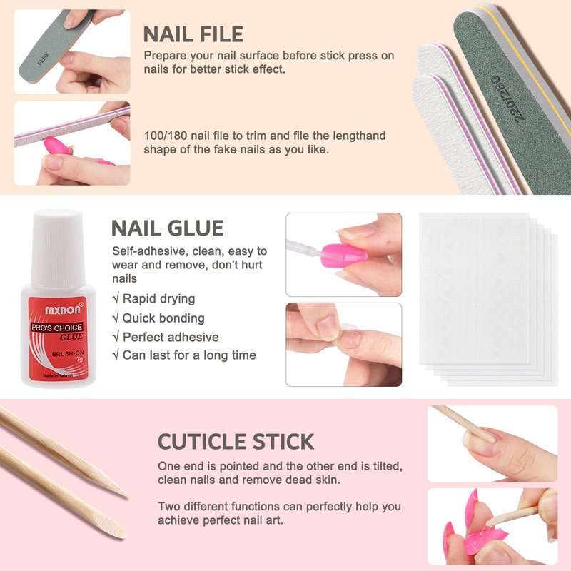 - Auxiliary nail tools: wooden nail sticks are double-sided. Inclined head is used to push the cuticle of nails. A sharp head can clean your nails and help to relieve the pressure on them. nail file helps to prepare the nail surface before sticking nails.
