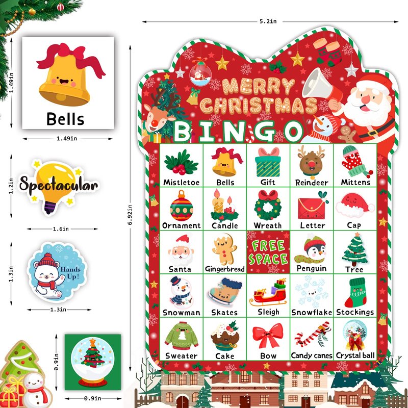 Christmas game party favors bingo games and bingo cards are full of cute and vibrant colors patterns to make people feel happy and kids learn more about Christmas ornament including the santa, raindeer, snowman, gingerbread man and so on.
