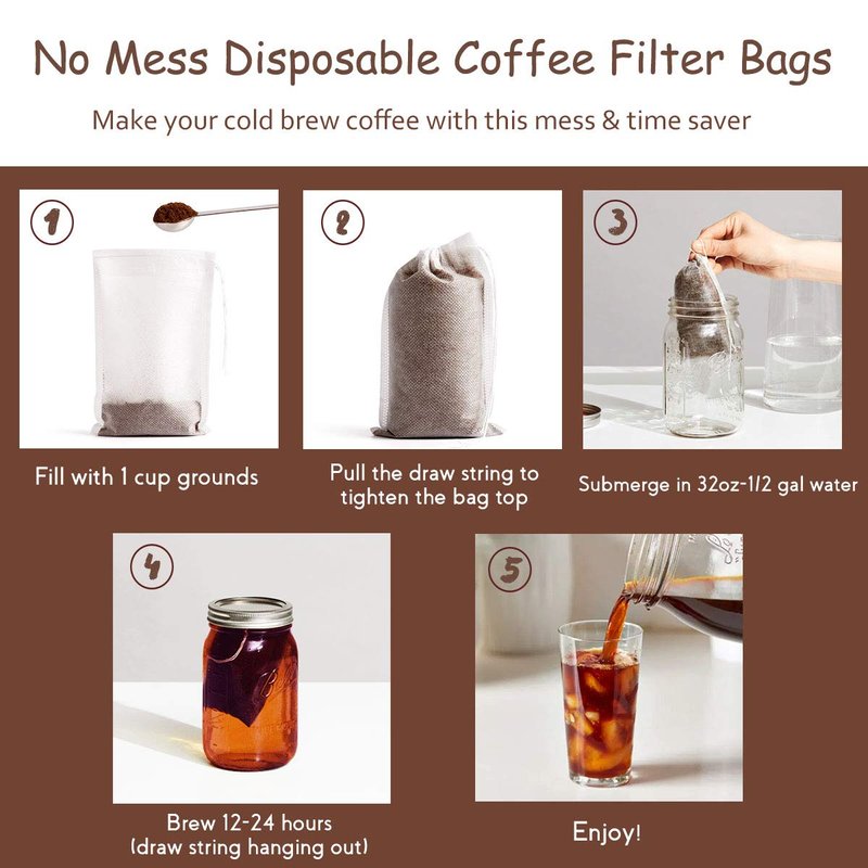 - Disposable, Use Without Mess - No need to rinse, wash another nylon mesh or cotton filter! This single use cold brew filter bags are as easy as: put the coffee grounds into this filter, brew with cool water and steeping in the fridge overnight (12-15 hours)