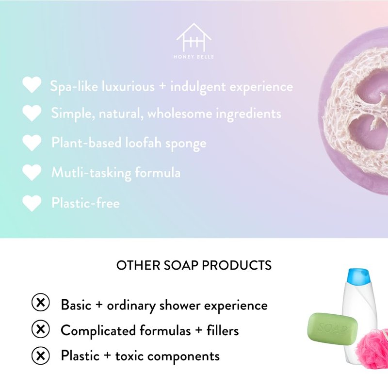 - Gentle Exfoliating Experience - This soap bar features a built-in loofah sponge derived from dried gourd fibers. It is a natural, unbleached, eco-friendly sponge that gently exfoliates to help get rid of dead skin! It is gentle and safe for sensitive skin.