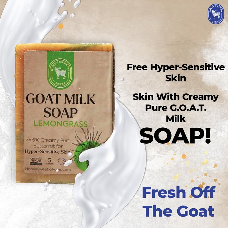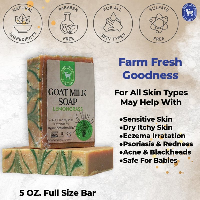 • Experience the hydrating power of our Lemongrass Goat Milk Soap, crafted with high butterfat from Nigerian dwarf goats for deep moisturization.