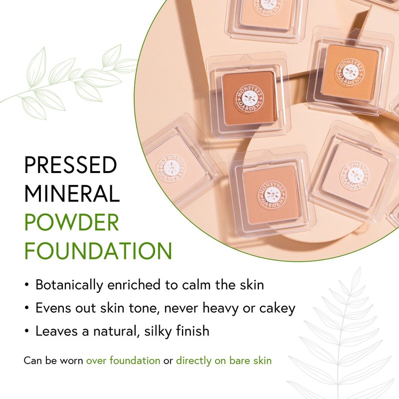 Discover your skin's true beauty with Honeybee Gardens Radiant Refill - Pressed Mineral Powder Foundation Refill! Our versatile, botanically enriched pressed powder foundation is designed to not only cover imperfections but also calm and nourish your skin. The natural, silky finish evens out your skin tone, providing adjustable coverage that never feels heavy or cakey. Our formula is gentle on your skin, free from talc, parabens, fragrances, and oil. Enriched with soothing vitamin E and botanical extracts, our powder foundation protects and nurtures your skin as it covers. The result - a refined, matte, and shine-free complexion that radiates confidence. Our eco-friendly approach means that we offer our Pressed Mineral Powder Foundation as a refill only. Pair it with our refillable foundation compact (sold separately) to help reduce packaging waste and make a positive impact on the planet. Customize your finish with a cotton puff or kabuki brush to achieve your desired level of coverage. Available in a range of stunning shades, from Geisha to Sultana, you're sure to find the perfect match for your skin tone. Feel good about your beauty choices with our CERTIFIED gluten-free and PETA CERTIFIED Vegan & Cruelty-Free foundation. PLEASE NOTE: This purchase includes the pan of pressed powder only. The Refillable Foundation Compact can be purchased separately. Choose Honeybee Gardens Radiant Refill for a naturally flawless finish while making a difference for a happier planet!