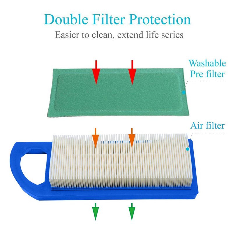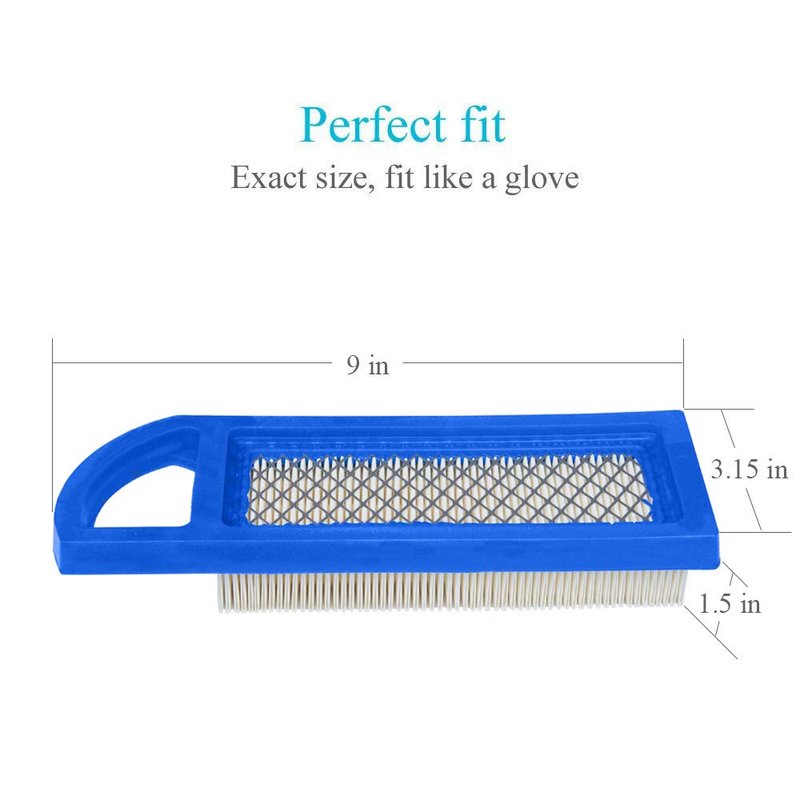 Color: Blue Size: 9" Length, 3-3/16" Width, 1-1/2" Height HOODELL Brand Advantage: HOODELL focus on Lawn & Garden equipment, providing high quality and professional parts with great service. Individually Well-packed and Extend Life Series Replacement Air Filter, Also Compatiable with: for Briggs and Stratton air filter 697014 797008 794472. for Briggs and Stratton air cleaner 4206 5076 5078 4211 4214 5077h 5077K 286H77-0121 284H07 284H77 285H77 31E707 31E777 31F777 31G777 31H777 31P677. for Stens 102-875, Oregon 30-122, Lowes 59471, Cub Cadet, Scotts, Sabre walk behind / riding lawn mower/tractor air filter. Excellent Quality: Factory filter: more than 10 years of manufacturing experience. Tested: checked one by one before sending out. Meet OEM standards: correct size, fit like a glove. Package Includes: 2 x excellent air filter 2 x foam and wire screen pre filter For Optimal Use: When your lawnmower emit black smoke or feel tired, timely replacement is needed. Put a little vaseline on the gasket before installation, will help air intake.