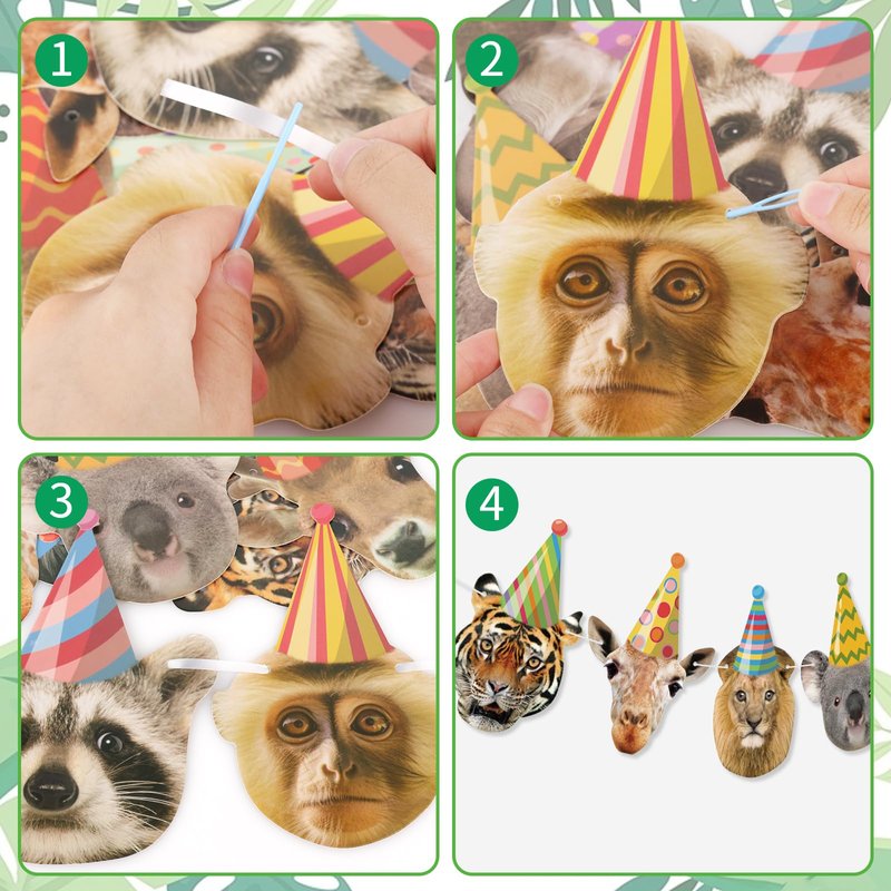 - Package Includes: Safari birthday banner with 10 different expressions and a roll of silver ribbon, not pre-strung, please use the included plastic pins to string the ribbons with all the animal faces, the benefit is that you can customize the length according to the available space