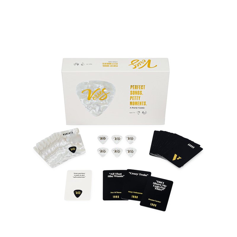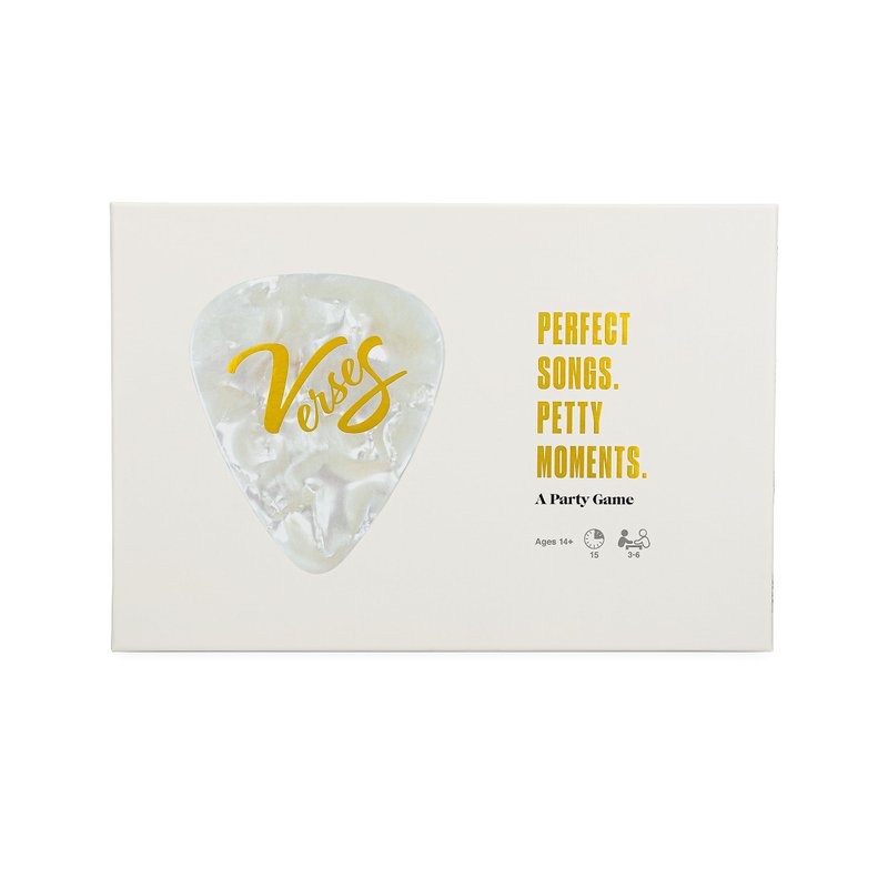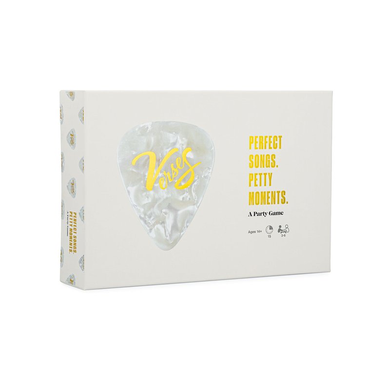 Life is full of moments… wild, rude, or downright cringe. Verses is the head nodding party game that gives these moments a beat! Players match Moment Cards with Song Cards—featuring the biggest bangers from the past few decades—hoping their choice is voted the funniest. Know the audience that you’re playing to and give the fans what they want, because they hold your fate in their hands. Everybody votes with their guitar pick. See who’s got the most lyrical sense of humor at your game night. Verses–It’s the party game that SLAPS! Features 300 Song Cards and 100 Moment Cards. Designed for 3-6 players, ages 14 and up.