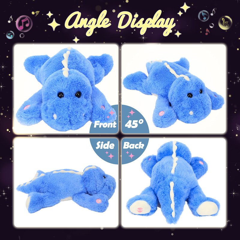 - MUSICAL LIGHT UP PLUSH: This soft stuffed animal glows in the dark. The magical dinosaur features a soothing lullaby sound and a color-changing glowing effect. Light up your kid's dormitory and help reduce the anxiety caused by the dark in your little ones. There are 10 songs are contained. Your kids can learn to sing with it and will get much fun.